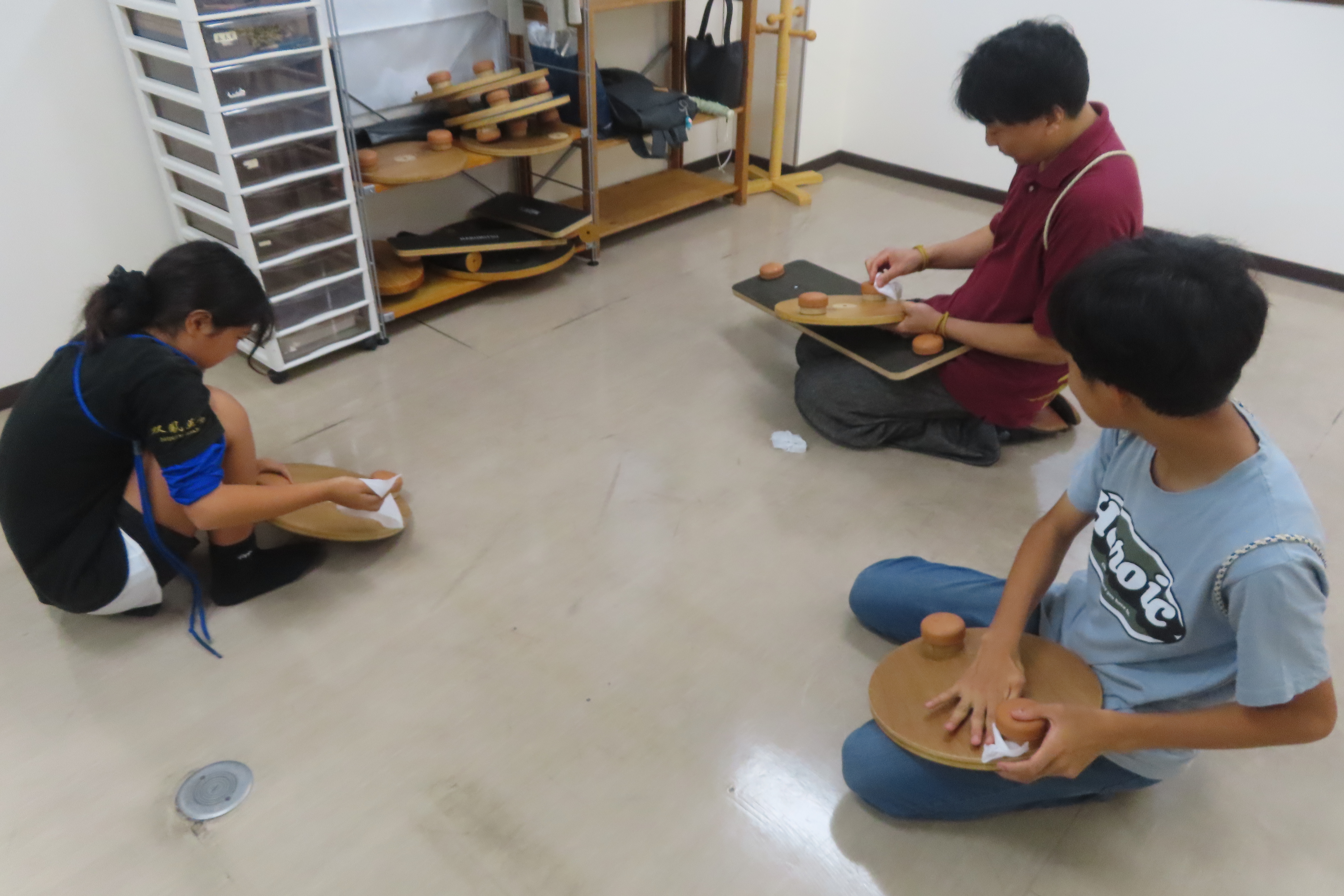 先生と一緒にウエットティッシュで、ご自身の使ったバランスボートを